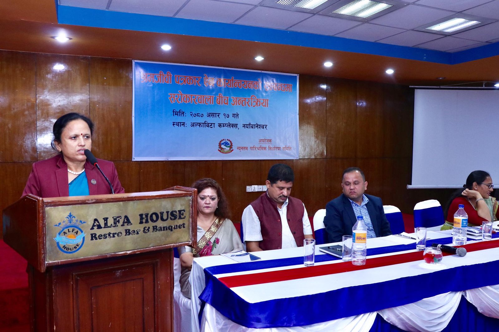 श्रमजीवी पत्रकारको न्यूनतम पारिश्रमिक निर्धारण समितिले गरेको सरोकारवालासँगको अन्तक्र्रियालाई सम्वोधन गर्दै उहाँले श्रमजीवी पत्रकार ऐन कार्यान्वायनमा केही चुनौती देखिए पनि यसको कार्यान्वयन अनिवार्य भएको बताउनुभएको हो । यसका साथै मिडिया क्षेत्रका समस्या समाधान गरेर लैजानुपर्ने पनि उहाँले बताउनुभयो ।